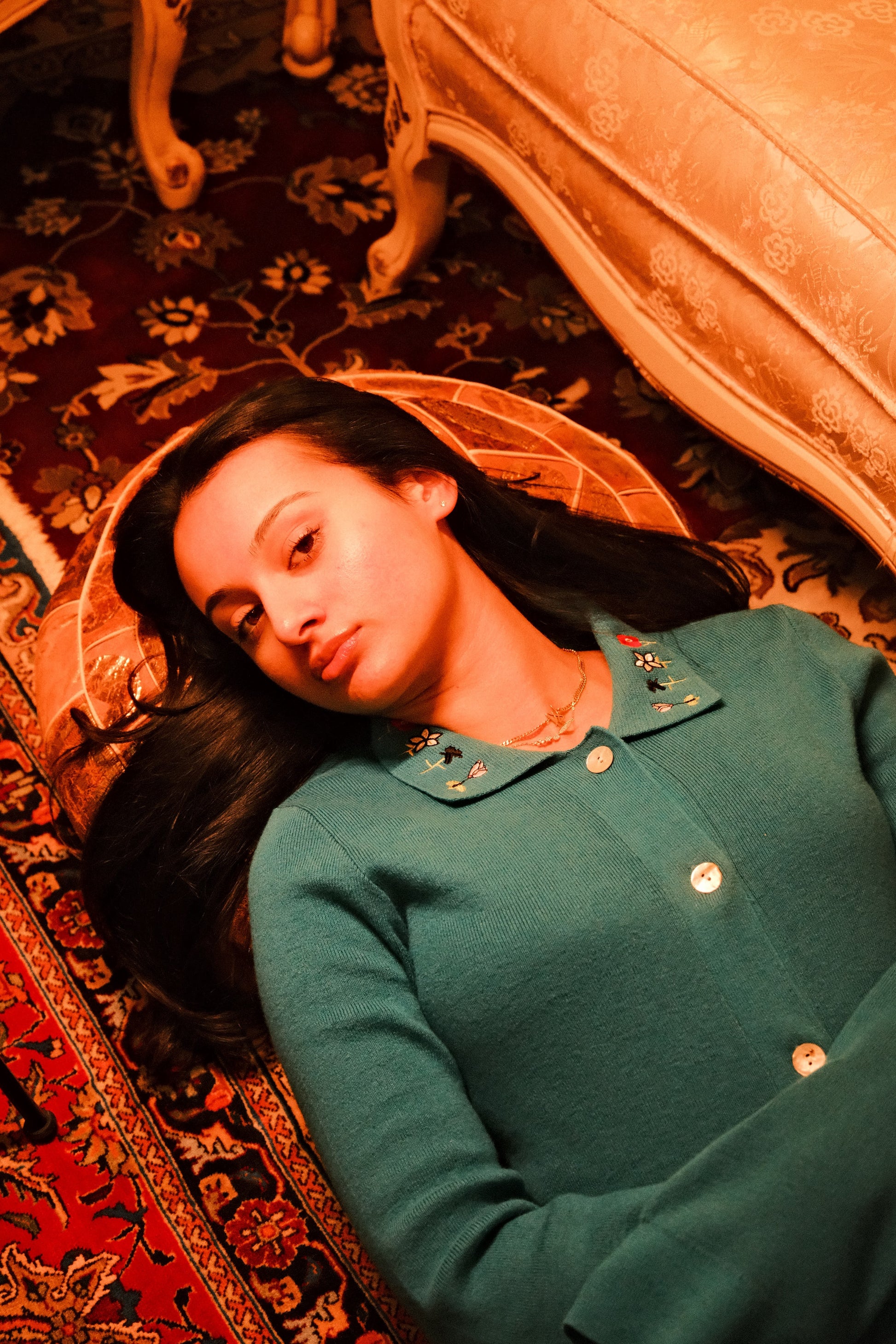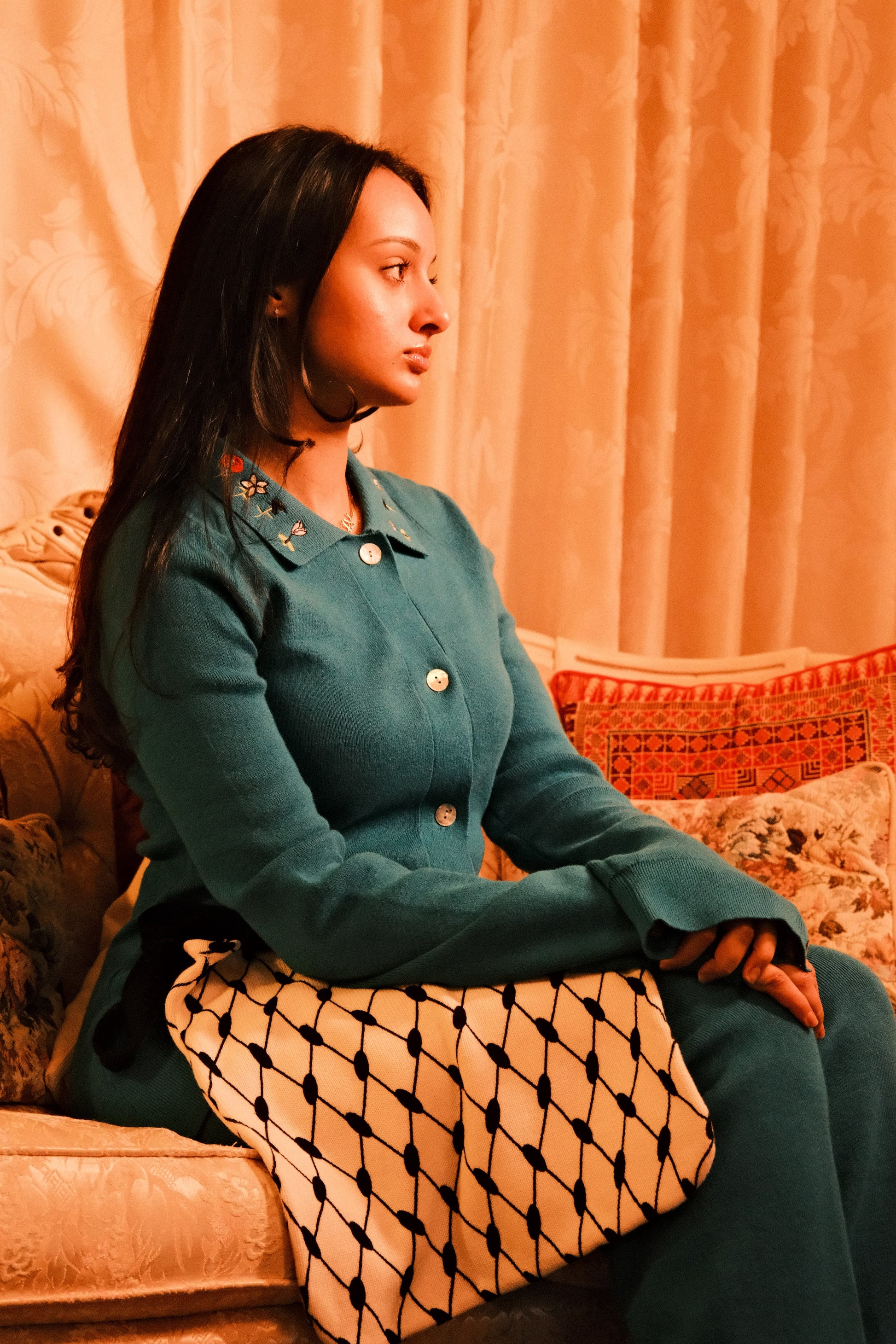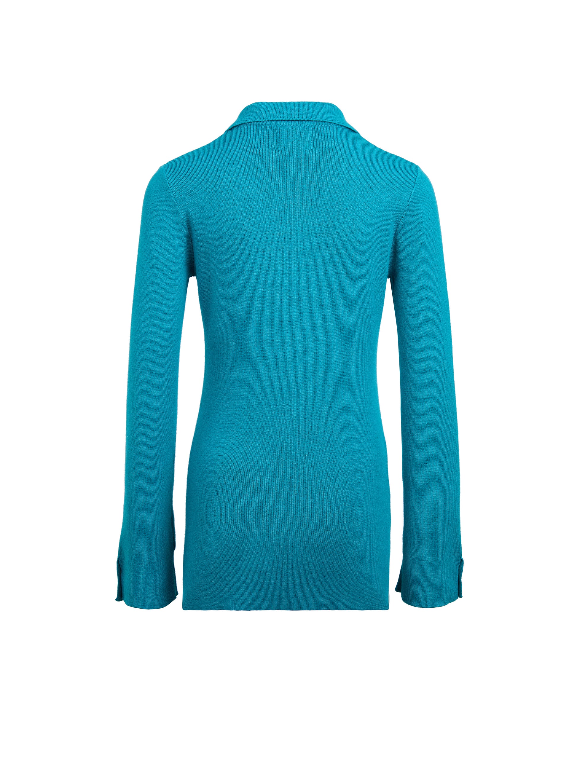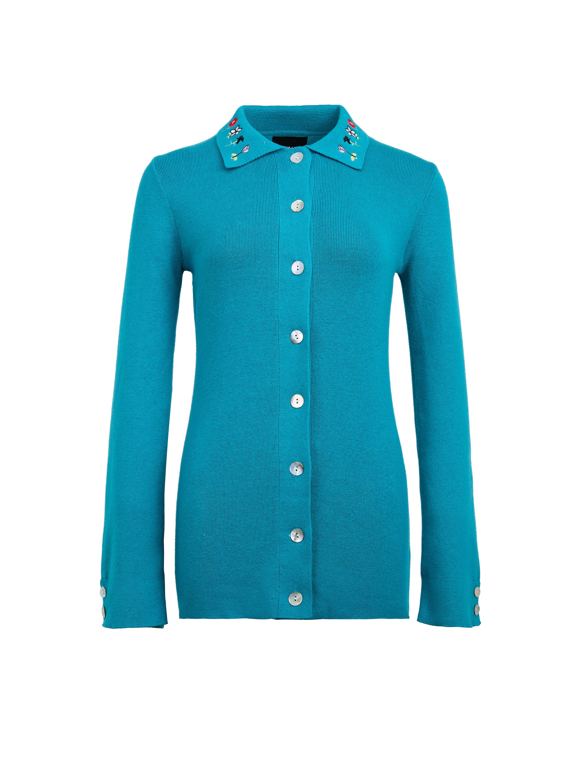 Finished with subtle embroidery of Levant flowers at the collar, pearl buttons at the sleeves, and along the center front for closure. This piece balances femininity and ease. Flared bell sleeves add movement and softness, while the fitted shape makes it equally suited for everyday wear or more polished styling. Designed to be worn on its own or paired with the matching knit pants.