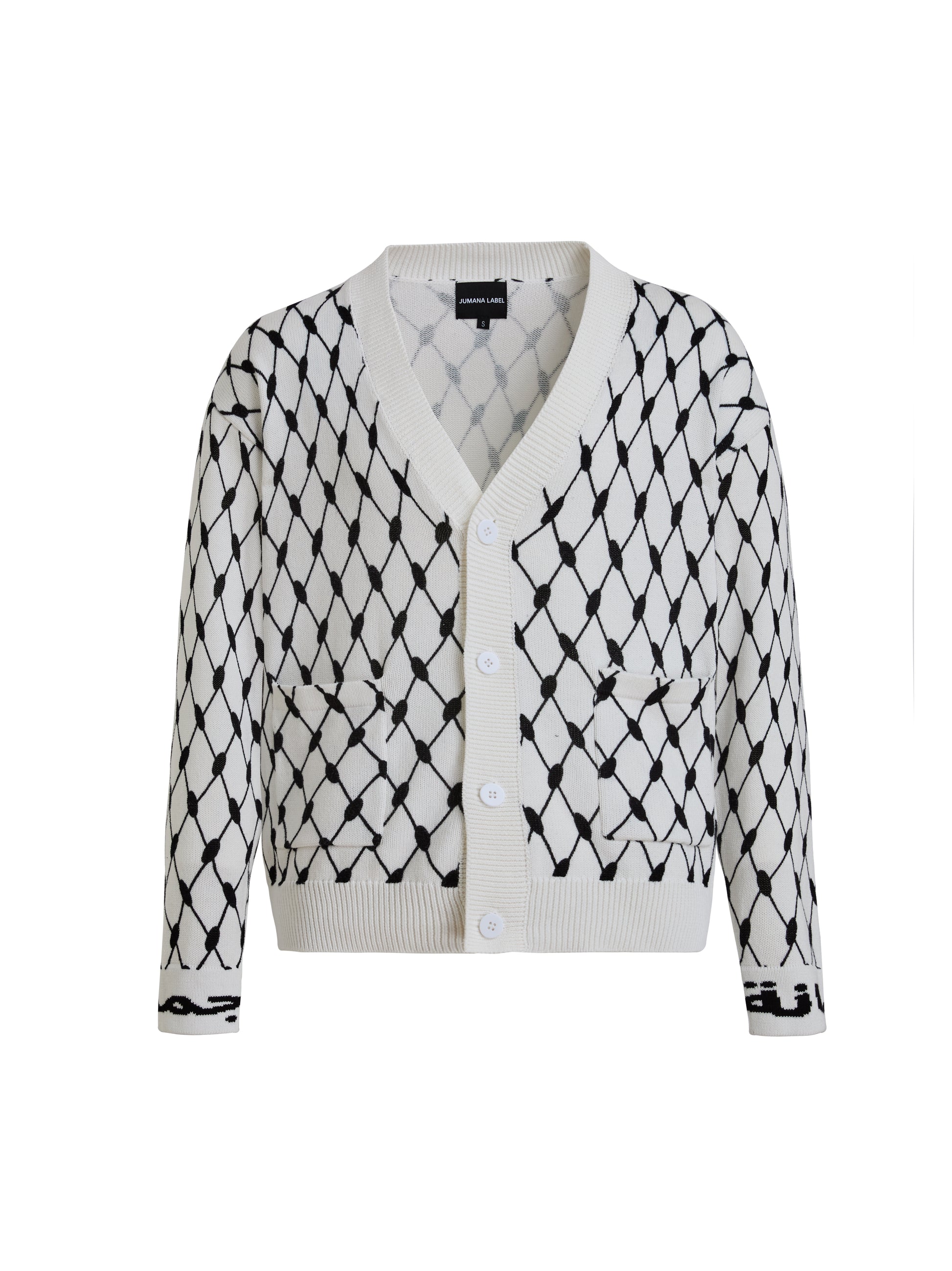 Keffiyeh reimagined: this 100% cotton cardigan transforms the iconic pattern into a modern, semi-oversized silhouette. With a drop-shoulder fit and Arabic “Jumana” detailing on the cuffs, it balances comfort with cultural heritage, a timeless piece to be worn across seasons.